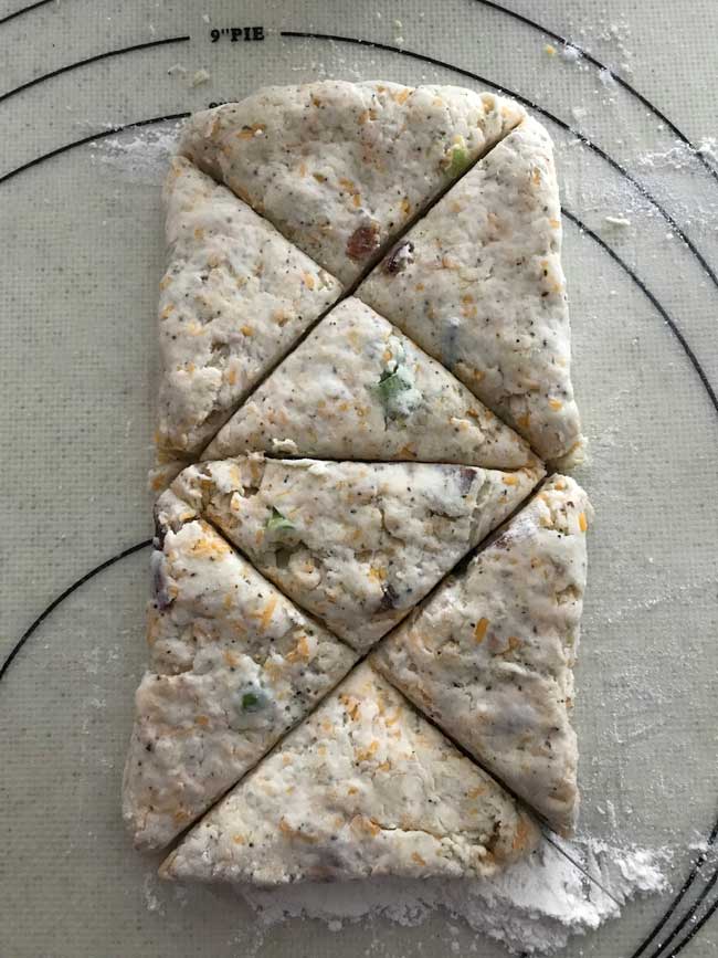 - Turn the dough onto a large pastry mat (or floured surface) and gently knead in any loose flour. Shape into a rectangle about 4x8 inches. Cut the rectangle into two 4 inch squares, then cut each square into a triangle so you have four big scones. Cut triangles in half again for mini scones.