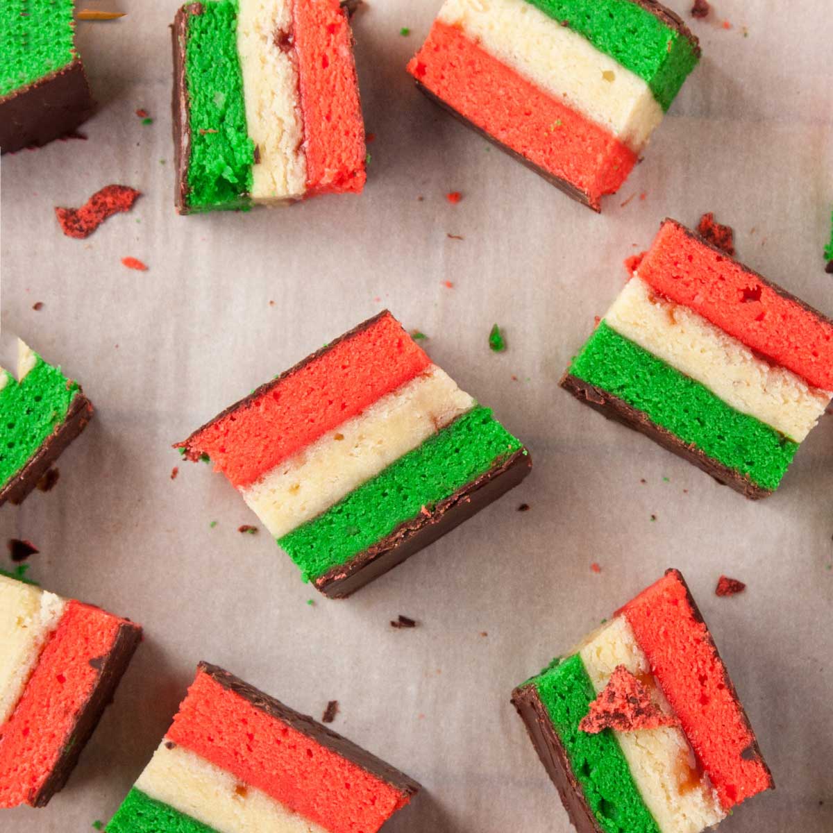 Tri-Color Cookies aka Rainbow Cookies are yellow, pink and green cakes filled with apricot preserves and topped with chocolate.