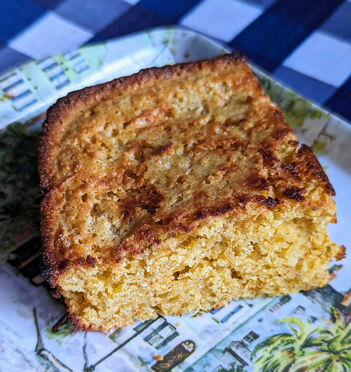 For an even smaller batch, you can quarter the recipe, in which case you'll have a real thin cornbread. That's actually not a bad thing because you get a high crust to crumb ratio. With eggs being so expensive (update: not anymore!), just add 12-15 grams of one and save the rest of the egg for another half batch of something. That being said, this cornbread keeps well so you might as well make a full or half batch (in which case you're still going to have half an egg to use in something else).