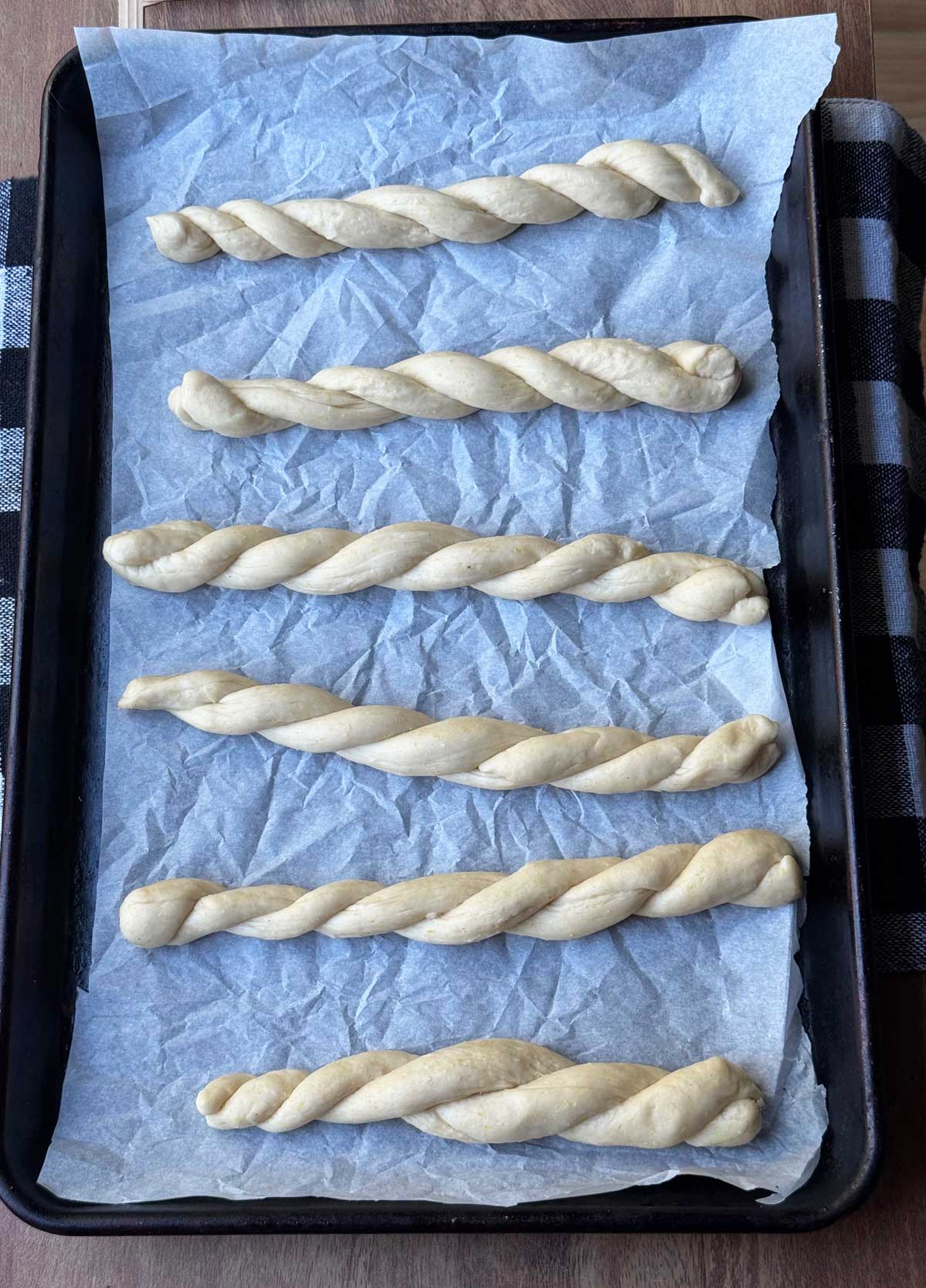 - Working one strand at a time, cut the strand lengthwise into two thin 10 inch pieces. Cross them like an X, then twist strands together from the middle up and middle down. Set on the baking sheet(s)