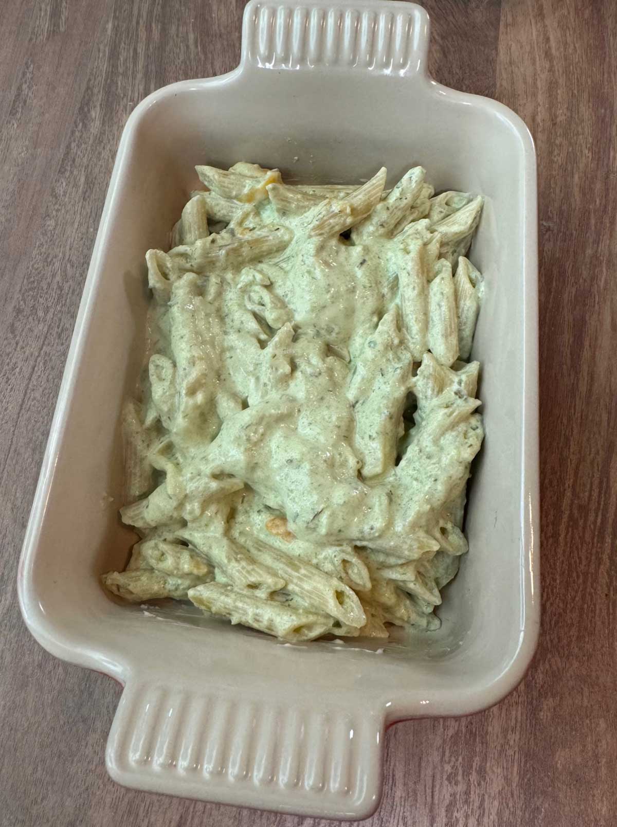 Assembly is pretty easy. You blend the roasted pepper with sour cream, a dash of sugar, and milk, then toss the roasted pepper mixture with cooked pasta and some of the cheese. Lay it in your dish, cover with foil, then bake. Uncover, add more cheese and bake until cheese melts. You can assemble a few hours ahead of time and bake later if you wish. Here's my slightly smaller batch all mixed and ready to cover with foil and bake. I didn't have any "Mexican blend" cheese and used another blend called 4 State Cheddar.